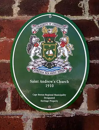 Municipal Heritage Property: On September 18, 2007 the Cape Breton Regional Municipality formally recognized St. Andrew's United Church as a Municipally Registered Property under the Nova Scotia Heritage Property Act, Chapter 199 of the revised Statutes, 1989, amended 1991, c. 10; 1998, c. 18, s. 561; 2010, c. 54[4][9] The Cape Breton Regional Municipality designated St. Andrew's Church and the property it sits on, recognizing St. Andrew's for its early and continuing presence in the community as well as the striking architecture. It is one of the few brick buildings in the area, and is impressive for its size and beauty.[4]