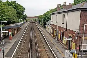 Platform 1 (Southbound) has a waiting room, ticket office, cycle storage and a photo booth, whilst Platform 2 (Northbound) has a shelter, a payphone and cycle storage. There are live dot-matrix departure screens, for passenger information and platform CCTV on both platforms. The platforms are linked via a stepped bridge but both may be accessed via road.[2]