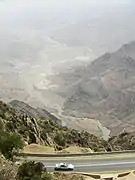 The mountain wall drops abruptly on the western side toward the Red Sea, leaving the narrow coastal plain of Tihamah. The eastern slopes are not as steep, allowing rare rainfall to help create oasis around the springs and wells of the few wadis.