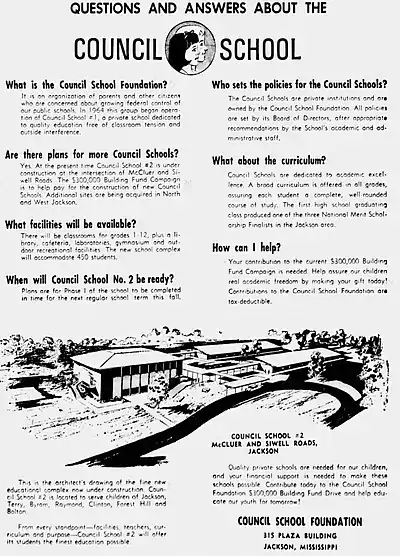 For much of its early life, the school was located at Sykes Road and Wheatley Drive in south Jackson, and operated as a K-9 school. In 1985 the school merged with the McCluer Academy, another segregation academy.[3] The combined school used the former McCluer Academy campus on Siwell Road for the high school and middle school. The school ultimately moved all operations to that campus and sold the Wheatley property in the late 1990s following the construction of an elementary school building at the Siwell campus.
