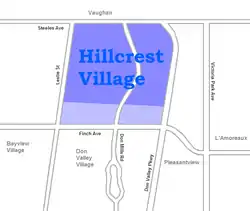 Hillcrest Village is a neighbourhood located in the district of North York at the northernmost tip of the city of Toronto, Ontario, Canada. Hillcrest Village is considered by some to be part of the Don Valley Village, the neighbourhood directly to the south; however, it is quite distinct. It is bordered by Finch to the South, Leslie Street to the West, Steeles to the North and Victoria Park to the East. Both neighbourhoods share the Don Valley as a point of reference in the Eastern border of the neighbourhoods.