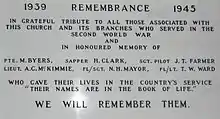 Either side of the founding parishioners plaque are commemorations of Hillhead Baptist Church congregations who died in the 1914–18 and 1939-45 wars. Totally 32 parishioners died in the 1914-18 war, one of whom, Captain Watson T Dick received the Military Cross, and 6 died in the Second World War.