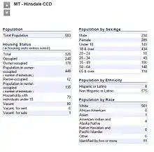 - "Hinsdale, Montana 2010 Demographics". U.S. Census Bureau. Archived from the original on January 29, 2016. Retrieved January 8, 2015.