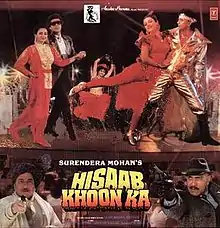 Hisaab Khoon Ka is a 1989 Indian Hindi-language film directed by Surendra Mohan, starring Mithun Chakraborty, Raj Babbar, Poonam Dhillon, Mandakini in leas roles. It got very good opening and did reasonably well in interiors but in the wave of Tridev & Batwara which both were still going with packed houses, it didn't get success at the box office.