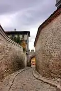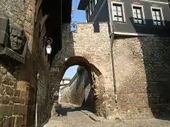 Hisar Kapia is a medieval gate in Plovdiv's old town and one of the most famous tourist sights in the city. The gate was built in the 11th century AD over the foundations of a gate from Roman times (probably from the 2nd century AD). Hisar Kapia is one of the three entrances (Eastern, Northern and Southern) to the acropolis of ancient Plovdiv. During the rule of the Ottoman empire revival houses were embedded in the remains of the old stone walls around the gate.[1]