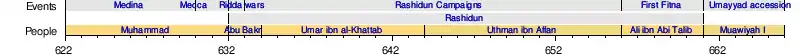 According to the traditional acccount,[2][6] the Islamic prophet Muhammad began receiving what Muslims consider to be divine revelations in 610 CE, calling for submission to the one God, the expectation of the imminent Last Judgement, and caring for the poor and needy.[4][7] Muhammad's message won over a handful of followers (the ṣaḥāba) and was met with increasing opposition from Meccan notables.[4][8] In 622 CE, a few years after losing protection with the death of his influential uncle ʾAbū Ṭālib ibn ʿAbd al-Muṭṭalib, Muhammad migrated to the city of Yathrib (now known as Medina).[4] With the death of Muhammad in 632 CE, disagreement broke out over who would succeed him as leader of the Muslim community during the Rāshidūn Caliphate.[2][9][10][11]