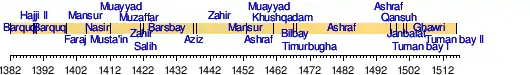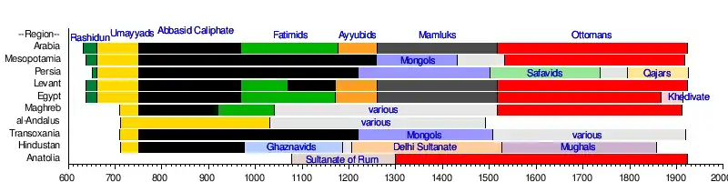 The following timeline can serve as a rough visual guide to the most important polities in the Islamic world prior to the First World War. It covers major historical centers of power and culture, including Arabia, Mesopotamia (modern Iraq), Persia (modern Iran), Levant (modern Syria, Lebanon, Jordan and Israel/Palestine), Egypt, Maghreb (north-west Africa), al-Andalus (Iberia), Transoxania (Central Asia), Hindustan (including modern Pakistan, North India and Bangladesh), and Anatolia (modern Turkey). It is necessarily an approximation, since rule over some regions was sometimes divided among different centers of power, and authority in larger polities was often distributed among several dynasties. For example, during the later stages of the Abbasid Caliphate, even the capital city of Baghdad was effectively ruled by other dynasties such as the Buyyids and the Seljuks, while the Ottoman Turks commonly delegated executive authority over outlying provinces to local potentates, such as the Deys of Algiers, the Beys of Tunis, and the Mamluks of Iraq.