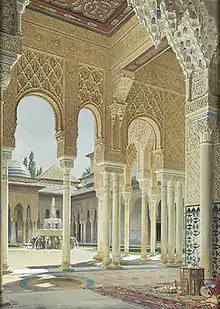 The military conflicts subsided as Harun al-Rashid ruled.[115] His reign was marked by scientific, cultural and religious prosperity. He established the library Bayt al-Hikma ("House of Wisdom"), and the arts and music flourished during his reign. The Barmakid family played a decisive advisorial role in establishing the Caliphate, but declined during Rashid's rule.[116]