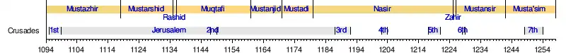After the siege of Damascus (1134),[136] Zengi undertook operations in Syria. Al-Mustarshid attacked sultan Mas'ud of western Seljuq and was taken prisoner. He was later found murdered.[137] His son, Al-Rashid failed to gain independence from Seljuq Turks. Zengi, because of the murder of Dubays, set up a rival Sultanate. Mas'ud attacked; the Caliph and Zengi, hopeless of success, escaped to Mosul. The Sultan regained power, a council was held, the Caliph was deposed, and his uncle, son of Al-Muqtafi, appointed as the new Caliph. Ar-Rashid fled to Isfahan and was killed by Hashshashins.[132]