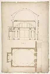 The examples from Florence are mostly from the early Renaissance, in the fifteenth century. Cities within Florence's zone of influence, such as Genoa, Milan, and Turin, mainly produced examples later, from the sixteenth century on.[10] Brunelleschi's domes at San Lorenzo and the Pazzi Chapel established them as a key element of Renaissance architecture.[11] His plan for the dome of the Pazzi Chapel in Florence's Basilica of Santa Croce (1430–52) illustrates the Renaissance enthusiasm for geometry and for the circle as geometry's supreme form. Twelve ribs between twelve circular windows converge on a small oculus. The circular dome rests on pendentives decorated with circular medallions of Florentine ceramic. This emphasis on geometric essentials would be very influential. The dome of the Certosa di Pavia (1396–1473) has a ribbed or spoked wheel design. The dome of San Sisto in Piacenza (1499–1514) is circular and also includes pendentives with circular medallions.[12] Another early example is Giuliano da Sangallo's 1485 design of a dome on the church of Santa Maria delle Carceri in Prato. Like that of the Pazzi Chapel, the dome is ribbed.[13] Another Renaissance dome with a ribbed or spoked wheel design is that of the Madonna di Campagna in Piacenza (1522–1528).[14]