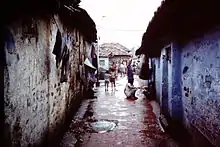The area where the city is now located was originally inhabited by the people of three villages: Kalikata, Sutanuti and Gobindapur. However, the boundaries of the three villages gradually became less distinct, and before the battle of Plassey, the city could be divided into four different sub-areas: European Kolkata (Dihi Kolkata); a residential village with some sacred spots (Gobindapur); a traditional Indian market (Bazar Kalikata or Burrabazar); and a riverine mart concentrating on cloth trade (Sutanati).[6] After the battle of Plassey in 1757, the Company started rebuilding the city.
