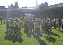 Leicester moved into the new 32,000-seat Walkers Stadium at the start of the 2002–03 season. Walkers, the crisp manufacturers, the club's former shirt sponsors acquired the naming rights for a ten-year period.[2] In October 2002, the club went into administration with debts of £30 million. Some of the reasons were the loss of TV money (ITV Digital, itself in administration, had promised money to First Division clubs for TV rights), the large wage bill, lower than expected fees for players transferred to other clubs and the £37 million cost of the new stadium.[3] Adams was banned from the transfer market for most of the season, even after the club was rescued by a takeover in February 2003 by a consortium led by Gary Lineker. Adams guided Leicester to runners-up spot in Division One and automatic promotion back to the Premiership with more than 90 points. In reaction to Leicester's restructuring of their debts, the Football League changed their rules and now penalise teams going into administration with a ten-point penalty. There was some bitterness from other clubs over this point, and because Leicester retained some good players from the Premiership (although several were sold). In an interview in mid-2006, chairman Andrew Taylor stated debt was about £25 million, including a "mortgage" of £15–18 million on the Walkers Stadium to the company (not the club) that owns it.[4] Leicester were relegated from the Premiership in 2003–04 with 33 points, along with Leeds United and Wolverhampton Wanderers. The Stadium was renamed King Power Stadium in 2011 after the take-over of Thai-based duty free company King Power.