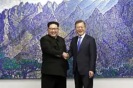 Moon Jae-in is the current president of South Korea. He was inaugurated on 10 May 2017. As President, His tenure so far has seen an improving political relationship with North Korea, some increasing divergence in the military alliance with the United States, and the successful hosting of the Winter Olympics in Pyeongchang. Moon Jae-in has met with North Korean chairman Kim Jong-un at the April 2018 inter-Korean summit, May 2018 inter-Korean summit, and September 2018 inter-Korean summit. During the COVID-19 outbreak, President Moon had gained positive reputation both domestically and internationally with the initial successes of controlling the outbreak.[130] Subsequent outbreaks from 2021, however, has caused his ratings to plummet.[131] As of 2021, South Korea recorded more deaths than births, resulting in a population decline for the first time on record.[132]