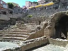Tauromenium again played a conspicuous part during the Sicilian wars of Sextus Pompeius, son of Pompey the Great, and, from its strength as a fortress, was one of the principal points of the position which he took up in 36 BC, for defence against Octavian (later Imperator Caesar Augustus). It became the scene also of a sea-fight between a part of the fleet of Octavian, commanded by the triumvir in person, and that of Pompeius, which terminated in the defeat and almost total destruction of the latter.[11] The victor selected Tauromenium to receive a Roman colony, probably as a measure of precaution, on account of the strength of its situation, as we are told that he expelled the former inhabitants to make room for his new colonists.[12] Strabo speaks of it as one of the cities on the east coast of Sicily that was still subsisting in his time, though inferior in population both to Messana and Catana.[13] Both Pliny and Ptolemy assign it the rank of a colonia,[14] and it seems to have been one of the few cities of Sicily that continued under the Roman Empire to be a place of some consideration. Its territory was noted for the excellence of its wine,[15] and produced also a kind of marble which seems to have been highly valued.[16] Juvenal also speaks of the sea off its rocky coast as producing the choicest mullets.[17] The Antonine Itinerary places Tauromenium 32 miles from Messina, and the same distance from Catania.[18]