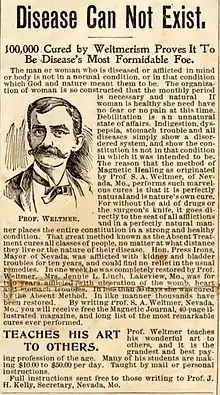 A feature of the dissemination of magnetism in the New World was its increasing association with spiritualism.[101] By the 1830s mesmerism was making headway in the United States amongst figures like the intellectual progenitor of the New Thought movement, Phineas Parkhurst Quimby, whose treatment combined verbal suggestion with touch.[102] Quimby's most celebrated "disciple", Mary Baker Eddy, would go on to found the "medico-religious hybrid", Christian Science, in the latter half of the nineteenth century.[103] In the 1840s the American spiritualist Andrew Jackson Davis sought to combine animal magnetism with spiritual beliefs and postulated that bodily health was dependent upon the unobstructed movement of the "spirit", conceived as a fluid substance, throughout the body. As with Quimby, Davis's healing practice involved the use of touch.[102]