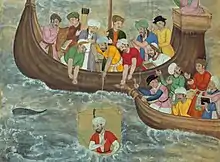 The concept of underwater combat has roots deep in antiquity. There are images of men using hollow sticks to breathe underwater for hunting at the temples at Thebes, but the first known military use occurred during the siege of Syracuse (415–413 BC), where divers cleared obstructions, according to the History of the Peloponnesian War. At the siege of Tyre (332 BC), Alexander the Great used divers, according to Aristotle. Later legends suggested that Alexander descended into the sea using a primitive submersible in the form of a diving bell,[1] as depicted in a 16th century illustration in the works of the Mughal poet Amir Khusrau.[2]