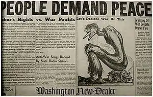 In October and November, after the Soviets invaded Finland and forced mutual assistance pacts from Estonia, Latvia and Lithuania, the Communist Party considered Russian security sufficient justification to support the actions.[38] Secret short wave radio broadcasts in October from Comintern leader Georgi Dimitrov ordered Browder to change the party's support for Roosevelt.[38] On October 23, the party began attacking Roosevelt.[39] The party was active in the isolationist America First Committee.[40]