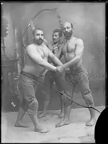 A tradition of combining wrestling and showmanship originates in 1830s France, when showmen presented wrestlers under names such as “Edward, the steel eater”, “Gustave d’Avignon, the bone wrecker”, or “Bonnet, the ox of the low Alps” and challenged members of the public to knock them down for 500 francs.[27] In 1848, French showman, Jean Exbroyat formed the first modern wrestlers’ circus troupe and established a rule not to execute holds below the waist — a style he named "flat hand wrestling". This new style soon spread to the rest of Europe, the Austro-Hungarian Empire, Italy, Denmark and Russia under the names of Greco-Roman wrestling, Classic wrestling or French wrestling.