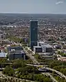 The building's glass facade wraps the structure of the building like a tensioned membrane. Circular ventilation elements in the form of individually opening windows enable natural ventilation and provide a reference to the outside world by making the background noise noticeable even on the upper floors. The tower with 50,200 m2 (540,000 sq ft) is flanked by four seven-storey buildings (approximately 8,525 m2 (91,760 sq ft) each) referred to as "campus" which are connected by a transparent roof. A fifth building houses 139 apartments.