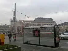 Bus stop under Astoria Palace today, showing the crowded space of this busy stop after the building's construction