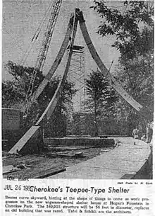 Because of the shape of the shelter, it garnered a great deal of both media and public attention. "It will be a departure from the usual rectangular-shaped shelters built in parks in the past."[9] So it was that Al Blunk, photographer for the Louisville Times captured an early construction shot of the raising of the oversized laminated wood beams. The Times reported "Beams curve skyward, hinting at the shape of things to come"[18]
