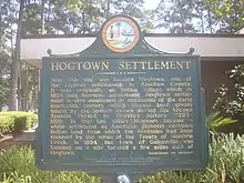 Hogtown was a 19th-century settlement in and around what is now Westside Park in Gainesville, Florida, United States (in the northeast corner of the intersection of NW 8th Avenue and 34th Street) where a historical marker[1][2][3] notes Hogtown's location at that site and is the eponymous outpost of the adjacent Hogtown Creek. Originally a village of Seminoles who raised hogs, the habitation was dubbed "Hogtown" by nearby white people who traded with the Seminoles. Indian artifacts were found at Glen Springs, which empties into Hogtown Creek.[4] In 1824, Hogtown's population was 14. After the acquisition of Florida by the United States, white settlers began moving into the area. The 1823 Treaty of Moultrie Creek obliged the Seminoles to move to a reservation in central Florida. Under the terms of the treaty, Chief John Mico received $20 as compensation for the "improvements" the Seminoles had made in Hogtown.[5][6]