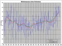 The Meteorological Observatory Hohenpeißenberg is the oldest mountain weather station in the world. It is located in the municipality of Hohenpeißenberg, about 60 kilometres southwest of Munich, Germany, and at 977 metres above sea level. Meteorological data is collected on the site continuously since 1781.[1] The measurement series ranks among the longest ever, and was never impacted by urban heat island effects, a problem encountered by the comparably long records from the Basel and Prague observatories.[2] As of today, it is operated by Deutscher Wetterdienst, and takes part in the Global Atmosphere Watch programme.