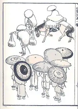 The first volume of 'Manga' (Defined by Hokusai as 'Brush gone wild'), was an art instruction book published to aid his troubled finances. Shortly after he removed the text and republished it.[3] The Manga evidence a dedication to artistic realism in portrayal of people and the natural world. The work was an immediate success, and the subsequent volumes soon followed. The work became known to the West since Philipp Franz von Siebold's lithographed paraphrases of some of the sketches appeared in his Nippon: Archiv Zur Beschreibung von Japon in 1831. The work began to circulate in the West soon after Matthew C. Perry's entry into Japan in 1854.[4]