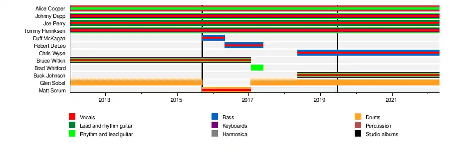 The band has released two studio albums featuring guest appearances by Paul McCartney, Dave Grohl, Joe Walsh, Zak Starkey and Christopher Lee, among others.[3] Cooper and Perry have discussed plans for a future live album, stating that Depp's schedule works differently than theirs.[4]