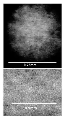 Holograms with x-rays are generated by using synchrotrons or x-ray free-electron lasers as radiation sources and pixelated detectors such as CCDs as recording medium.[46] The reconstruction is then retrieved via computation. Due to the shorter wavelength of x-rays compared to visible light, this approach allows imaging objects with higher spatial resolution.[47] As free-electron lasers can provide ultrashort and x-ray pulses in the range of femtoseconds which are intense and coherent, x-ray holography has been used to capture ultrafast dynamic processes.[48][49][50]