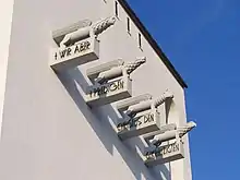 At the southern external wall of the steeple ends the bell chair basic bar in four winged animal figures with the heads of a human, a lion, a bull and an eagle. They symbolize the four evangelists Matthew, Mark, Luke and John. On the four girders is an inscription with a text from the First Epistle to the Corinthians (1 Corinthians 1, 23–24): Wir aber predigen Christus den Gekreuzigten, Christus Kraft und Gottes Weisheit (=But we preach Christ crucified, Christ the power of God, and the wisdom of God). Below the four animal figures is a plaster relief of the Veil of Veronica.[7] The relief was created by the sculptor Arnold Hensler from Wiesbaden. At the western and the eastern side of the bell steeple are each with a turret clock without cyphers. On property are in addition the 1957 established kindergarten, a parsonage building with a parish office and dwellings, a building with group and club areas, as well as a football pitch used by young people. The parish kindergarten of St. Josef was expanded in 2011 by another building in the former parish court on Ortenberger Straße.
