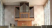 In 1964 the organ building company Gebr. Späth Orgelbau installed a typical pipe organ for this time. The tracker action works electrically, the organ stop loops are electro-pneumatically controlled. The organ was cleaned and overhauled in 2019 by the successor companies Freiburger Orgelbau Hartwig und Tilmann Späth. The freestanding organ console was completely redesigned and equipped with new organ stop rockers and LED lighting fixtures. The electrics were partially renewed, as well as the leather of the bellows, the membranes and other electro-pneumatic parts. The wind chests were overhauled and the wind supply stabilised by new bellows controls and a new motor. On the tonal level, the post-voicing gave the organ more character and softened loud sharpness. After the reconstruction and reversion, the Pommer 16' sounded as the supporting drone.[24][25]