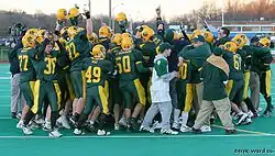 Holy Cross High School is well known in Connecticut for its football program. In 2006, the team won the first football state championship in the school's history, the Class SS State Championship, defeating Stratford 40–0. They were ranked third among all teams in the state, following Greenwich and Ansonia. In 2011 the Crusaders earned their second state championship with a 34–27 win over Cromwell in the Class S State Championship. The 12-2 Crusaders suffered only two defeats that season, both to Ansonia, the Class M State Champion. They finished ranked eighth in the state. {{{2}}}