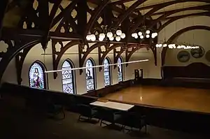 During his 1900 presidential campaign against William McKinley, orator and anti-imperialist William Jennings Bryan made a speech at the City Hall on his way to another at Harvard on February 3, 1900, greeted by a reported 2500-3000 attendees who completely filled the grand hall and corridors, with another 1000 said to be waiting to greet him on the lower floors.[13] Bryan would return to deliver a second speech in the Hall on January 10, 1902, and later that same year on October 27, Mother Jones would deliver a speech about the coal strike of 1902.[14][15] During a busy Massachusetts tour in his 1912 presidential campaign, Woodrow Wilson concluded a day of touring in Boston, Worcester, and Springfield with a campaign rally on the evening of April 27, 1912 in the grand ballroom, in tandem with speeches by Dudley Field Malone and Mayor Newton D. Baker of Cleveland.[16] Though prior to his campaign for president, then-Assistant Secretary of the Navy, Franklin D. Roosevelt would lead a fundraiser for the American Red Cross in a packed hall in 1918.[17] Following the legalization of boxing in Massachusetts, the grand hall was used for a time as a venue for hundreds of bouts, by the army and other promoters.[18] City Hall's auditorium was also briefly the home venue for the Interstate Basketball League's Holyoke Reds, who played only for a few seasons in the early 1920s, winning the league championship in 1923.[19] At the end of the Second World War the auditorium was renovated, but was kept as a basketball court from 1946 until these changes reversed in 1973 for the city's centennial.[2]