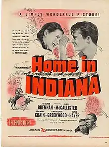 Home in Indiana is a 1944 Technicolor film directed by Henry Hathaway. The film, that stars Walter Brennan, Lon McCallister, Jeanne Crain, June Haver and Charlotte Greenwood, is based on the novel The Phantom Filly by George Agnew Chamberlain. The film was remade in 1957 as April Love.