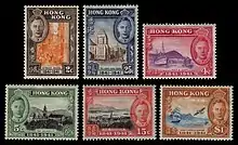 To mark the occasion, the Post Office issued a set of six commemorative stamps.[19][20] This set of stamps features various local sights and scenes to showcase the developments of Hong Kong as a British colony over the previous 100 years. The stamps were originally intended to be released in October 1940 but ultimately got published on 26 February 1941, exactly one month after the anniversary, because of delays.[19][20]