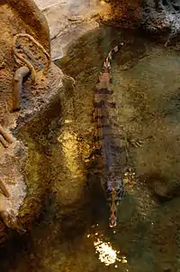 The outdoor enclosure is 8 by 9 metres (26 by 30 ft), of which 70% is pool area. With a maximum depth of 1-metre (3 ft 3 in), the pool is landscaped with plants to provide sheltered areas, hiding places and basking areas for the reptile. Outdoor facilities include some infra-red heaters, a heat pad and a weighing scale. Water in the pool is continuously circulated through a filtration system.