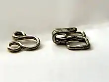 A hook-and-eye closure is a very simple and secure method of fastening garments together. It consists of a metal hook, commonly made of flattened wire bent to the required shape, and an eye (or "eyelet") of the same material into which the hook fits.