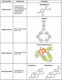 | 1 | Proteins / Peptide | Peptide hormones are made of a chain of amino acids that can range from just 3 to hundreds. Examples include oxytocin and insulin.[11] Their sequences are encoded in DNA and can be modified by alternative splicing and/or post-translational modification.[17] They are packed in vesicles and are hydrophilic, meaning that they are soluble in water. Due to their hydrophilicity, they can only bind to receptors on the membrane, as travelling through the membrane is unlikely. However, some hormones can bind to intracellular receptors through an intracrine mechanism. |