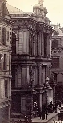 Horticultural Hall (1865-1901) of Boston, Massachusetts, was the headquarters of the Massachusetts Horticultural Society in the later 19th century. It stood at no.100-102 Tremont Street, at the corner of Bromfield Street, opposite the Granary Burying Ground.[1] Architects Gridley J.F. Bryant and Arthur Gilman designed the building.[2][3] Sculptor Martin Milmore created horticulturally-themed statuary for the building's exterior: "three ancient Roman goddesses ... Ceres, goddess of agriculture; Flora, goddess of flowers; and Pomona, goddess of fruit trees."[4] In the 1880s: "the ground floor [was] occupied by stores; the second story by the Library Room of the society and a hall for the weekly exhibitions; and the upper story by a large and elegant hall used ... at the annual and other important exhibitions. Both of these halls [were] often used for concerts and the better class of entertainments. The society's library, comprising over 4,000 volumes, [was] the most valuable collection of horticultural works in the United States. The halls [were] adorned with portraits and busts of the presidents, founders, and benefactors of the society."[5]