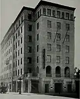 The hotel was built on property leased for 20 years by the Orndorff Hotel Company and built in the latter half of 1926.[1] It opened with 164 guest rooms in December 1929. Built at a cost of $1 million, it was a seven-story, reinforced-concrete building located at the southwest corner of Colorado Boulevard and Mentor Avenue. It was designed by architect McNeal Swasey of Los Angeles and included Romanesque and modified Mediterranean design elements.[2] The exterior included a frieze along the top of the building featuring stone panels of angels and griffins. The building was also decorated with wrought iron and cast stone, including images of centaurs and other mythical beasts.[3] It was one of 18 major hotels in Pasadena in 1929.[4]