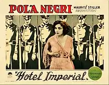Hotel Imperial is a 1927 American silent war drama film directed by Mauritz Stiller and released by Paramount Pictures. The film is set in Austria-Hungary during World War I and starring Pola Negri as a hotel chambermaid. It is based on the 1917 Hungarian play of the same name by Lajos Bíró.[1][2][3]