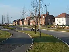 There are several community features in the development. Dollman Farm is a restored farmhouse which greatly pre-dates the new estate and is used as a visitor information centre.[3] The Barn is a community centre/village hall which holds communal classes and clubs and can be hired for parties or events.[4] The Tuning Fork is a restaurant/cafe which is open to the public.[5] Nearby is a large adventure play area. Finally a new primary school has been opened, St Gabriel's CofE Academy,[6] named after the patron saint of communications.