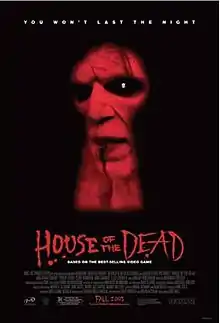 House of the Dead is a 2003 action horror film directed by Uwe Boll, from a screenplay by Dave Parker and Mark Altman, with a story by Altman and Dan Bates. Based on the video game franchise of the same name by Sega, it is not a direct adaptation of the individual entries; Boll described the film as a prequel to the original 1996 game. It stars Jonathan Cherry, Tyron Leitso, Clint Howard, Ona Grauer, Ellie Cornell, and Jürgen Prochnow. The film takes place on a fictional island infested by zombies, forcing survivors to fight their way off. House of the Dead was Boll's first film to be released theatrically, in addition to his first video game adaptation.