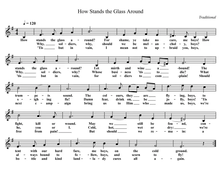 "How Stands the Glass Around", also referred to as "General Wolfe's Song", is an English folk song.[1] The lyrics express the suffering of soldiers, wherefore the song was primarily popular among people serving in the military.[2] It deals with the helplessness experienced during war and the boldness demanded in the military, but also about reducing fear and pain by consuming alcohol. One paper suggests that it was the favourite song of Alexander Hamilton.[3]