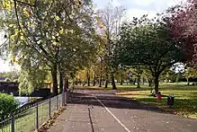 There is a bicycle path around the park, suitable for cyclists of all ages. Three parallel bridges connect the park to other areas of Kilmarnock, crossing the River Irvine. On one side of the park is a long hill, which slopes down to the central area of the park and the play area. The park is surrounded by a residential area, it has a variety of playground equipment and a new sport/exercise area.