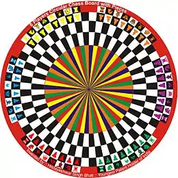 Bhati's version of multiplayer chess is played on a circular board with 228 black and white cells (or spaces). The 12 red spaces are not used. Up to six players in teams of two or three can play. Bhati's design employs all the standard chess pieces and their moves.[14][15] Individual armies are distinguished by colour.