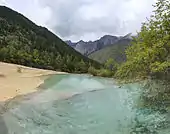 Huanglong (simplified Chinese: 黄龙; traditional Chinese: 黃龍; pinyin: Huánglóng; lit. 'yellow dragon') is a scenic and historic interest area in the northwest part of Sichuan, China. It is located in the southern part of the Minshan mountain range, 370 kilometres (230 mi) north-northwest of the capital Chengdu.[1] This area is known for its colorful travertine pools formed by calcite deposits, especially in Huanglonggou (Yellow Dragon Gully), as well as diverse forest ecosystems, snow-capped peaks, waterfalls and hot springs. Huanglong is also home to many endangered species including the giant panda and the Sichuan golden snub-nosed monkey.[1] In addition, a large population of the endemic orchid species 'Cypripedium plectrochilum' was discovered at the site [2] Huanglong was declared a World Heritage Site by UNESCO in 1992 because of its outstanding travertine formations, waterfalls and limestone formations as well as its travertine terraces and lakes rating among the three most outstanding examples in the world. [1][3]