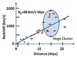 Combining his measurements of galaxy distances with Vesto Slipher and Milton Humason's measurements of the redshifts associated with the galaxies, Hubble discovered a rough proportionality between redshift of an object and its distance. Though there was considerable scatter (now known to be caused by peculiar velocities—the 'Hubble flow' is used to refer to the region of space far enough out that the recession velocity is larger than local peculiar velocities), Hubble was able to plot a trend line from the 46 galaxies he studied and obtain a value for the Hubble constant of 500 km/s/Mpc (much higher than the currently accepted value due to errors in his distance calibrations; see cosmic distance ladder for details).