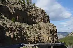 The Huckleberry Ridge Tuff is a tuff formation created by the Huckleberry Ridge eruption that formed the Island Park Caldera that lies partially in Yellowstone National Park, Wyoming and stretches westward into Idaho into a region known as Island Park.[2] This eruption of 2,200 km3 (530 cu mi) of material is thought to be one of the largest known eruptions in the Yellowstone hotspot's history. This eruption, 2.1 million years ago, is the third most recent large caldera-forming eruption from the Yellowstone hotspot. It was followed by the Mesa Falls Tuff and the Lava Creek Tuff eruptions.[3] The eruption likely occurred in 3 phases, separated by decades.[4]